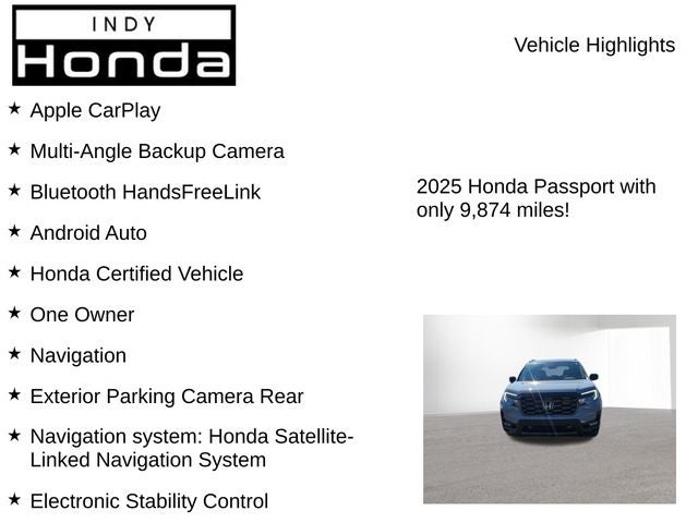 As a Honda Certified Pre-Owned vehicle, this Passport TrailSport has undergone a rigorous 182-point inspection and comes with a comprehensive warranty package, including a 24-month/100,000-mile limited warranty and an 84-month/100,000-mile powertrain warranty. Additionally, you'll enjoy the peace of mind of Honda Care Roadside Assistance and up to two complimentary oil changes within the first year of ownership.